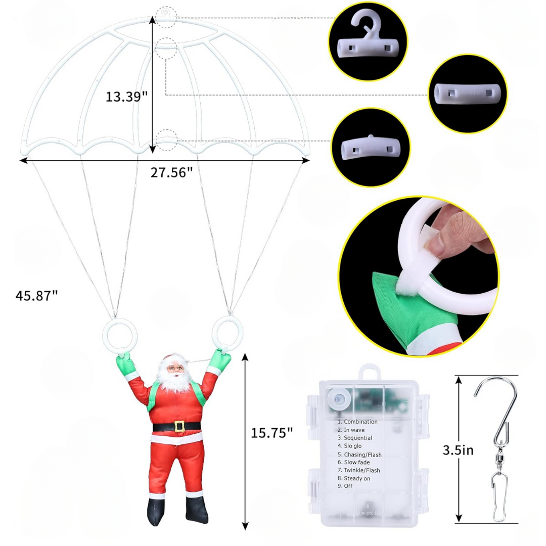 Diseño navideño único: Paracaídas iluminado con 128 luces LED multicolor (85.5 x 70 cm) y figura desmontable de Santa Claus (39.5 cm), ideal para colgar en interiores o exteriores.
